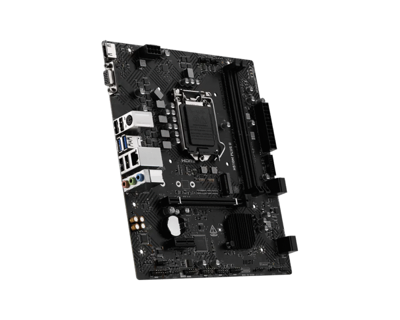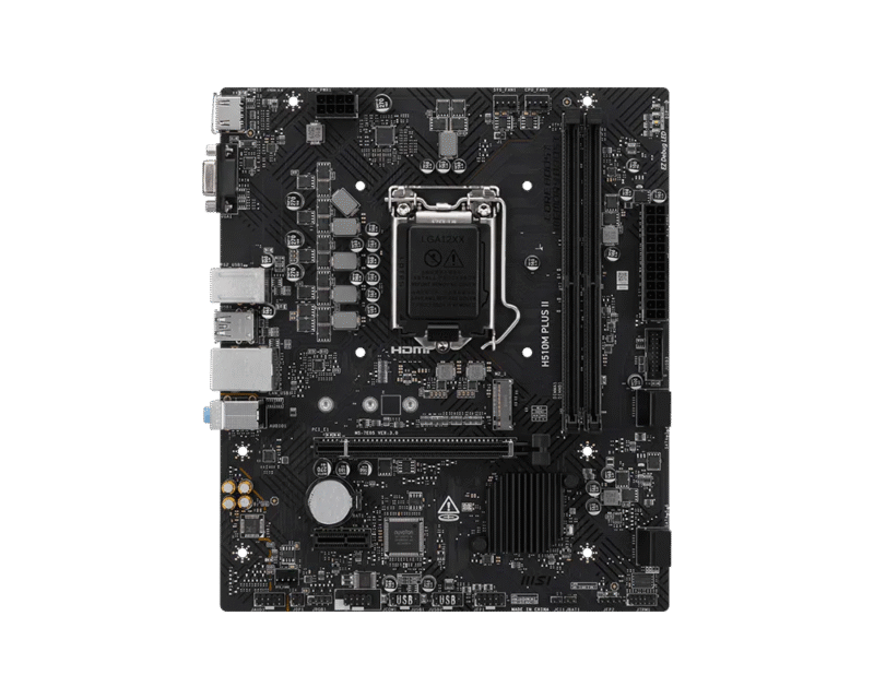 MSI PRO H510M PLUS II | CPU Support : Support Intel CSupports 10th Gen Intel® Core Processors, 11th Gen Intel Core Processors, Pentium Gold and Celeron Processors | CPU Socket : LGA 1200 socket | Chipset Intel : Z490 Chipset | EXPANSION SLOTS : 1 x PCIe 3.0 x16 slot , 1 x PCIe 3.0 x1 slot | Display Interface : Support 4K@60Hz as specified in HDMI 2.1, VGA Requires Processor Graphics | Memory Support : 2 DIMMs, Dual Channel DDR4-2933 MHz (MAX) | Storage : 1x M.2 Gen3 x4 32Gbps slot, 4x SATA 6Gbps ports | USB ports : 4x USB 3.2 Gen 1 5Gbps (4 Type-A), 8x USB 2.0 | LAN Realtek : RTL8111H Gigabit LAN | Audio : 8-Channel (7.1) HD Audio with Audio Boost | 3 YR WARRANTY